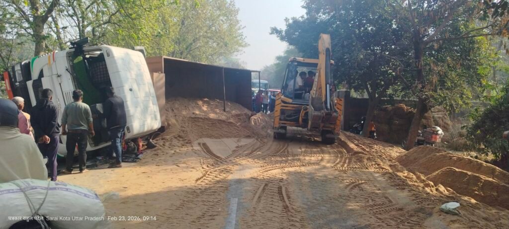 Ballia news: भरौली अनियंत्रित बालू लदा ट्रेलर पलटा, ड्राइवर-खलासी बाल-बाल बचे; एक घंटे तक यातायात बाधित