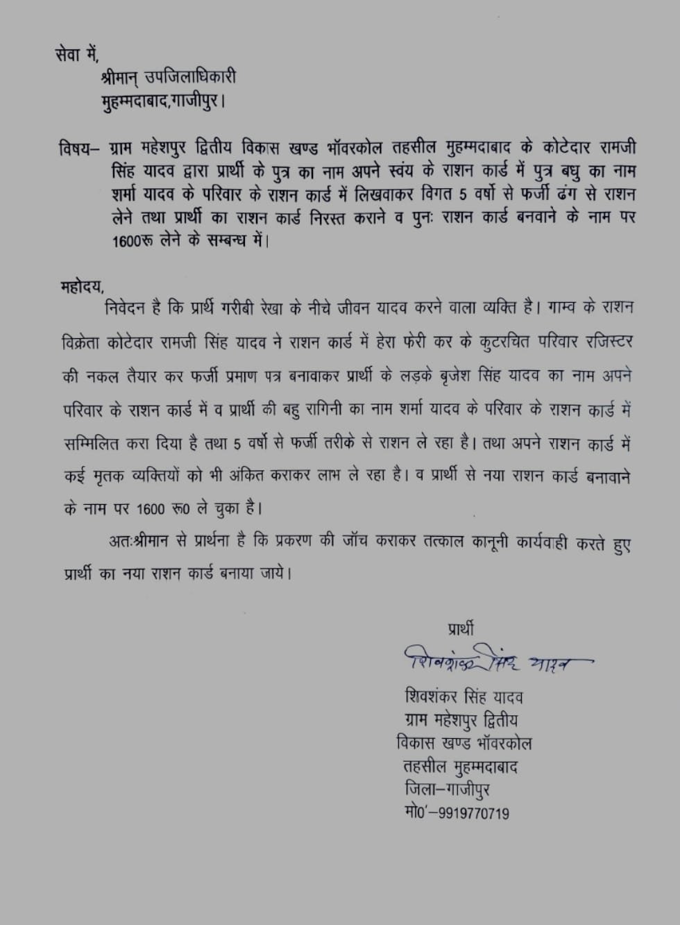 गाजीपुर। भांवरकोल विकासखंड के के महेशपुर द्वितीय ग्राम सभा में एक पीड़ित ने उपजिलाधिकारी को प्रार्थना पत्र देकर आरोप लगाया है कि कोटेदार द्वारा उसी ग्रामसभा के निवासी शिव शंकर यादव के पुत्र बृजेश यादव का नाम अपने परिवार के कार्ड सूची में डलवा दिया गया और पिछले 5 साल से राशन लिया जा रहा था। जब शिव शंकर यादव अपने बेटे के नाम का राशन कोटेदार से मांगते थे तो वह बताता था कि नाम कट गया है। इस दौरान कोटेदार ने प्रार्थी से कुछ रुपए राशन कार्ड में नाम जुड़वाने के नाम पर लिया। उसके बाद भी जब बात नहीं बनी तो शिव शंकर यादव ने अपने बेटे का नाम कहीं और से जुड़वाने का प्रयास किया। उसके बाद पता चला कि उनके बेटे का नाम तो चल रहा है और पिछले 5 साल से उसके नाम पर राशन कोई और ले रहा रहा है। इस मामले की शिकायत शिव शंकर यादव ने मुख्यमंत्री पोर्टल और एसडीएम मुहम्मदाबाद से किया है।उसके बाद एसडीएम ने उक्त मामले में जांच के बाद कार्रवाई करने की बात कही है। जानकारी के अनुसार यह भी बात सामने आ रही है कि शिव शंकर यादव का मामला ही महेशपुर में नहीं बल्कि कई मृतकों के नाम से भी पिछले दो साल से राशन उतर जा रहा है। अब देखने वाली बात होगी की जांच के बाद इसमें किस तरह की कार्रवाई की जा रही है।