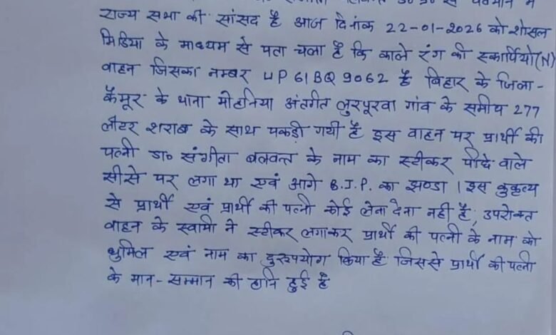 गाजीपुर। राज्यसभा सांसद डा. संगीता बलवंत के पति डा. अवधेश ने सदर कोतवाली में तहरीर देते हुए बिहार के कैमूर जिले में 277 लीटर शराब के साथ पकड़े गए वाहन मामले में कार्यवाही की माग की है। इस वाहन पर सांसद डॉ. संगीता बलवंत के नाम का स्टिकर और भाजपा का झंडा लगा था।