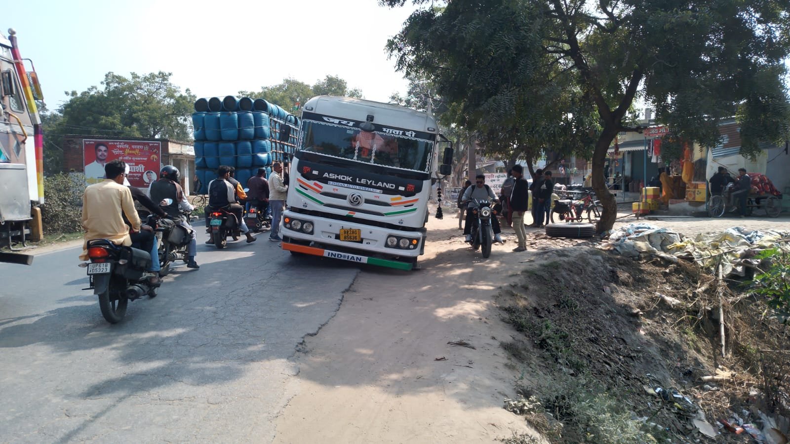 Ghazipur news: भांवरकोल बढ़नपुरा बालू लदे ट्रेलर का टायर फटा, दो घंटे लगा जाम, बड़ा हादसा टला