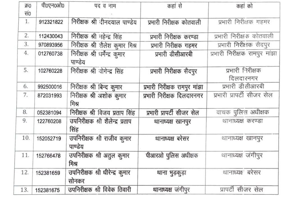 गाजीपुर में चला तबादला एक्सप्रेस लम्बे समय से जमें पुलिस विभाग में व्यापक फेरबदल किया गया है। पुलिस अधीक्षक डॉ ईरज रज़ा के आदेश पर निरीक्षकों और उपनिरीक्षकों के कार्यक्षेत्रों में बदलाव किया गया है।