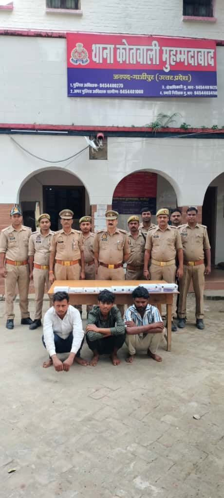 गाजीपुर। अपराध एवं अपराधियों के विरुद्ध चलाए जा रहे अभियान के तहत थाना मुहम्मदाबाद पुलिस ने शुक्रवार 17 अक्टूबर 2025 को बड़ी सफलता हासिल की। पुलिस टीम ने मीरगंज रेलवे क्रॉसिंग काली माता मंदिर के पास से अन्तर्राज्यीय गिरोह के तीन अभियुक्तों और एक बाल अपचारी को चोरी के माल व अवैध असलहा-कारतूस के साथ गिरफ्तार किया।