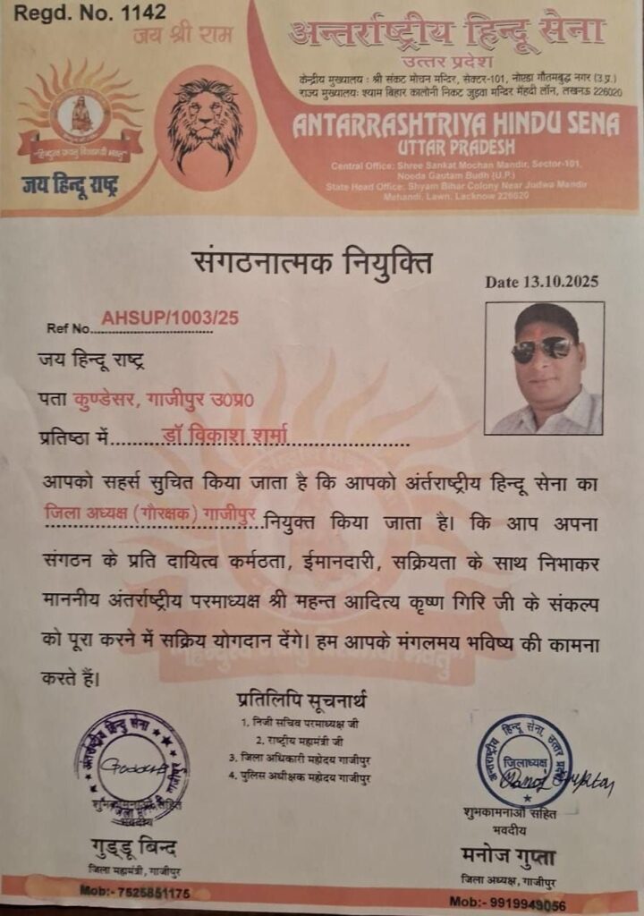 Ghazipur news: डॉ. विकास शर्मा बने अंतर्राष्ट्रीय हिन्दू सेना के गाजीपुर जिला अध्यक्ष, गौ-सुरक्षा और राष्ट्रहित में कार्य की अपेक्षा